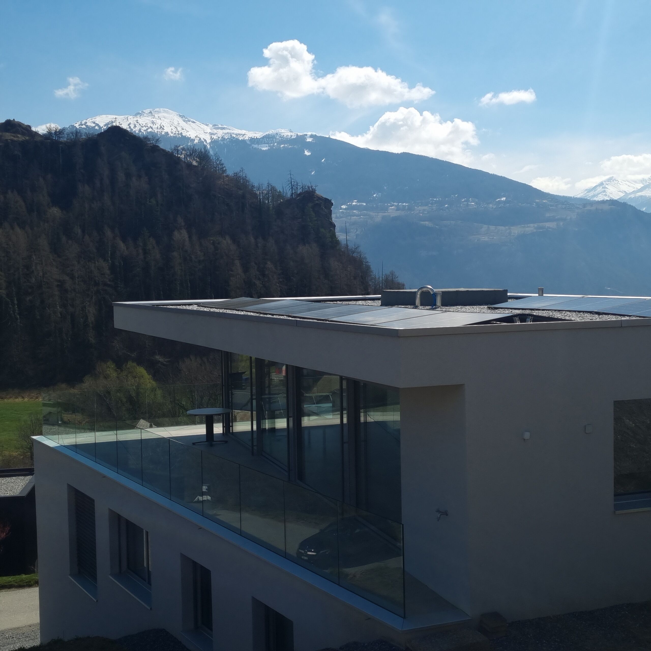La grande terrasse face aux Alpes offre une surface importante avec une vue splendide et vous permettra de recevoir vos amis dans un environnement de qualité. Les aménagements extérieurs seront à terminés par l'acquéreur (bitume devant le bâtiment + gazon).